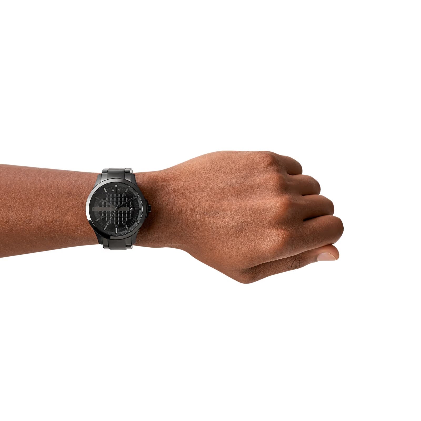 The men's Hampton AX2104 provides a sophisticated, all-black design. This analog timepiece features a black brushed and textured dial with a three-hand date movement, complemented by a matching black-plated stainless steel bracelet for a seamless and modern look.