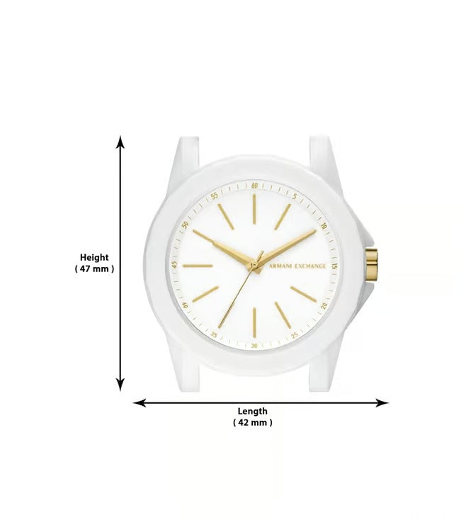 The women's AX7126 is a fresh, minimalist watch featuring a clean white dial and a comfortable white silicone strap. Ideal for a contemporary, sporty look, this analog timepiece offers a crisp aesthetic and durable construction suitable for casual daily wear.