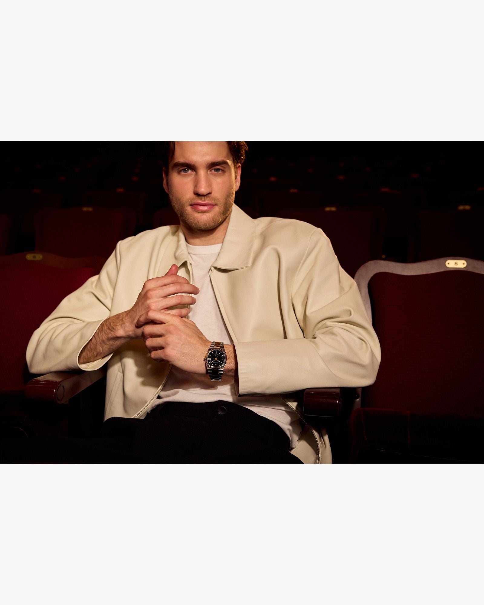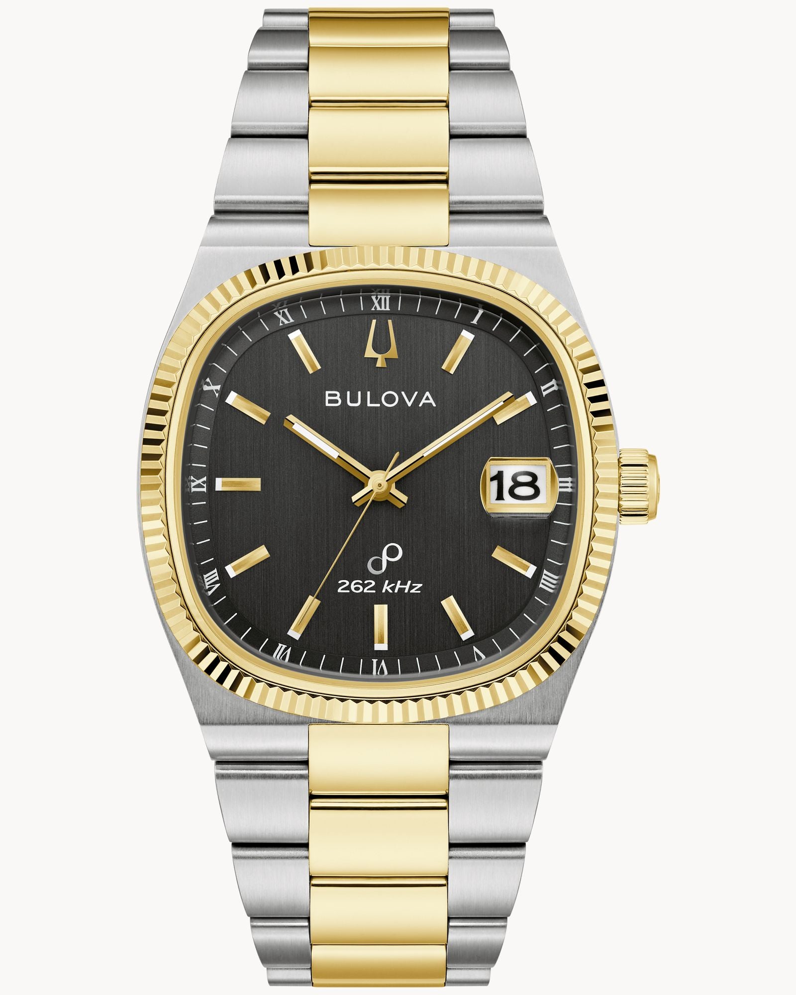 Bulova Super Seville 98B458 blends vintage inspiration with cutting-edge technology. Drawing from the iconic 1970s Super Seville Day-Date, this men’s watch features a striking 37.5mm two-tone stainless steel TV-shaped case and an integrated 3-link bracelet combining gold and silver tones. Its rich brushed black dial is complemented by polished gold-tone hands and indices, with a date window elegantly positioned at 3 o’clock and enhanced by a magnifying lens.