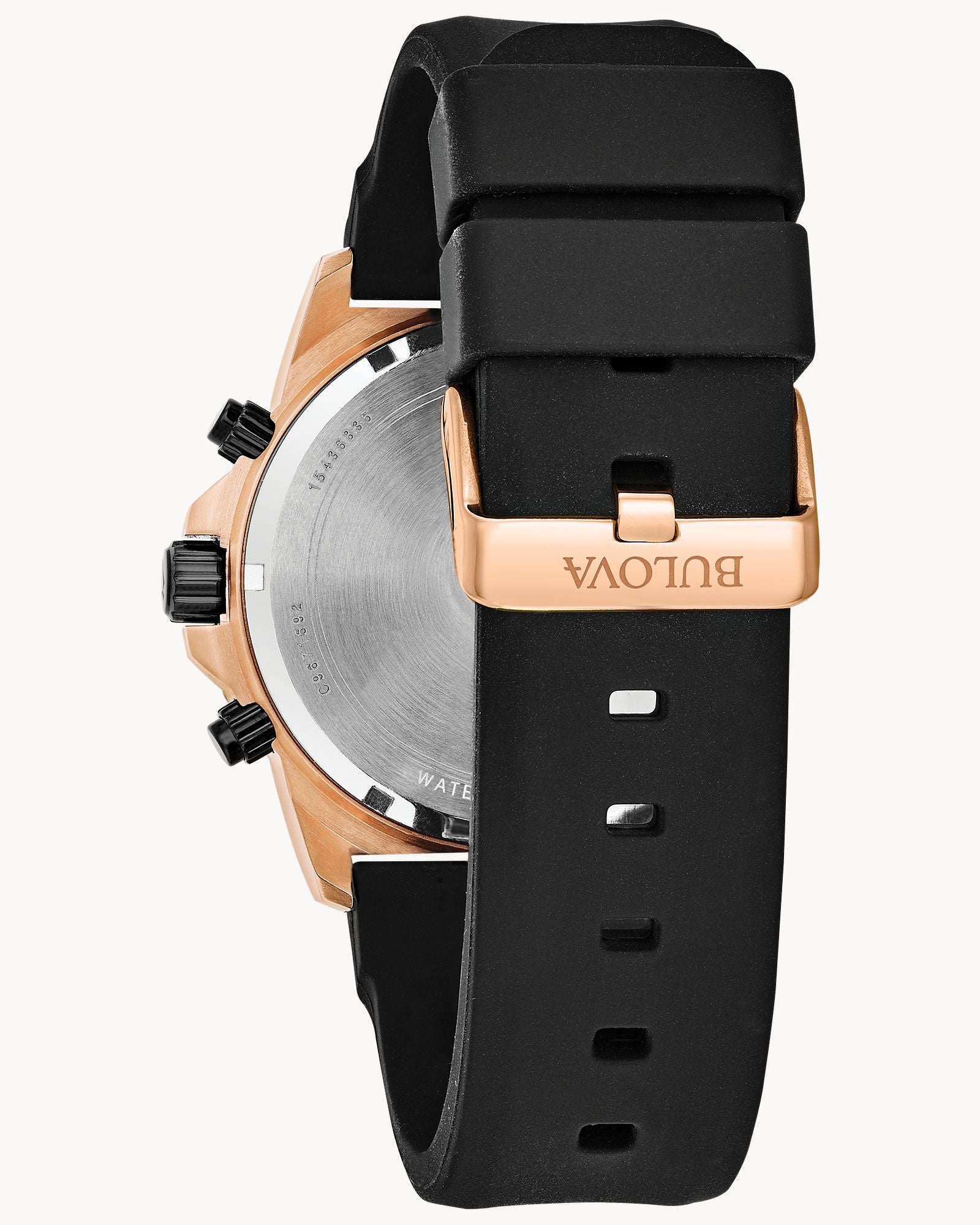 Bulova Marine Star Chronograph 98B104 is a perfect blend of Luxury sporty performance and refined style. Featuring a striking black dial with rose gold-tone accents, this high-performance watch is built for both adventure and elegance. The 44mm two-tone stainless steel case pairs seamlessly with a black silicone strap for comfort and durability. This chronograph includes a 6-hand quartz movement with a tachymeter and calendar function, housed under a mineral crystal designed for impact and shatter resistance.