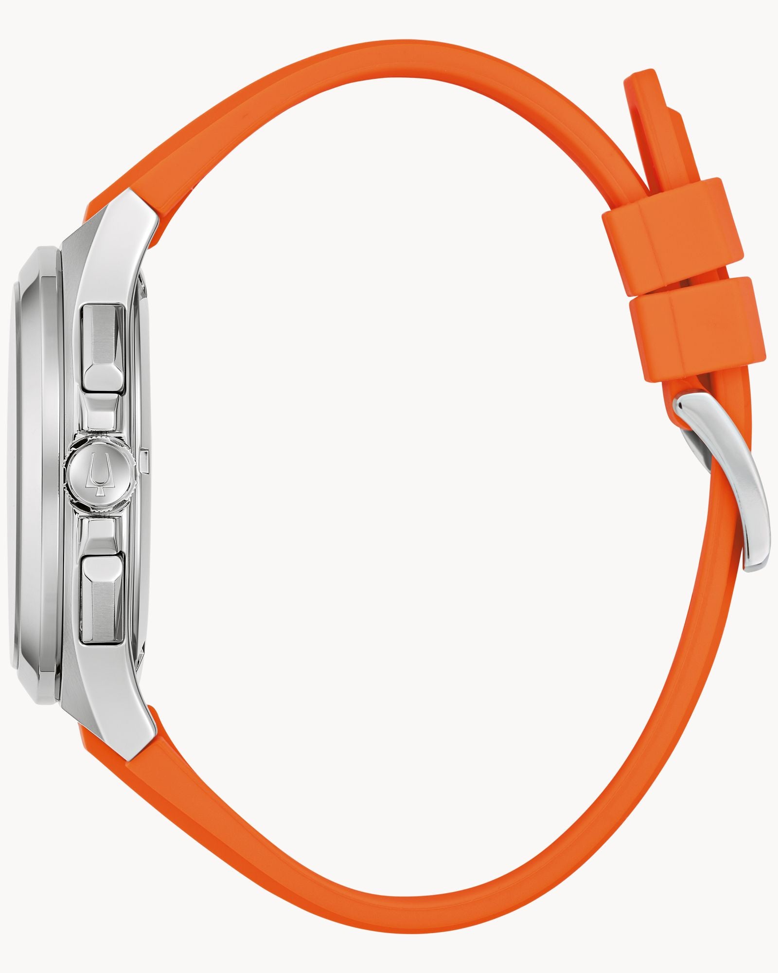 Bulova Maquina Marc Anthony 96B407 is a bold and modern men’s timepiece, designed in partnership with legendary performer Marc Anthony. The watch features a 46mm faceted silver-tone stainless steel case and a flat anti-reflective sapphire crystal for superior legibility and scratch resistance. The brilliant blue dial stands out with silver-tone and striking orange accents at 1, 3, and 5 o’clock, chosen by Marc Anthony to represent personal significance. Luminous hands, chronograph subdials for running seconds and a 60-minute counter, and a date display add both style and functionality.
