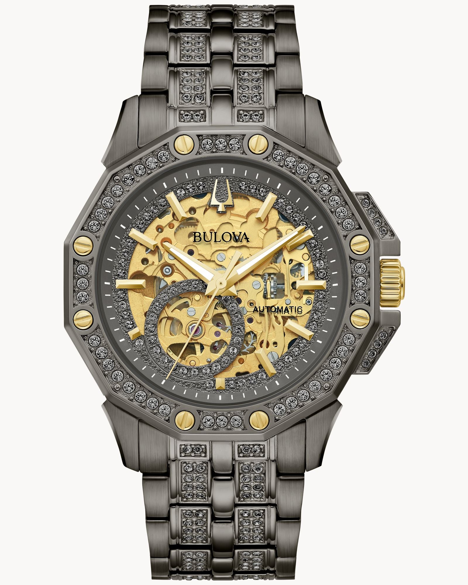 Bulova Octava blends modern sophistication with elegant crystal embellishments to create a standout automatic men’s watch. The 41.7mm gray ion-plated stainless steel case features a bezel adorned with 251 gray crystals that extend onto the dial and bracelet for a luxurious sparkle. The gray sunburst dial showcases gold-tone accents, luminous hands, and round gray crystals at the hour markers, enhancing both style and legibility.