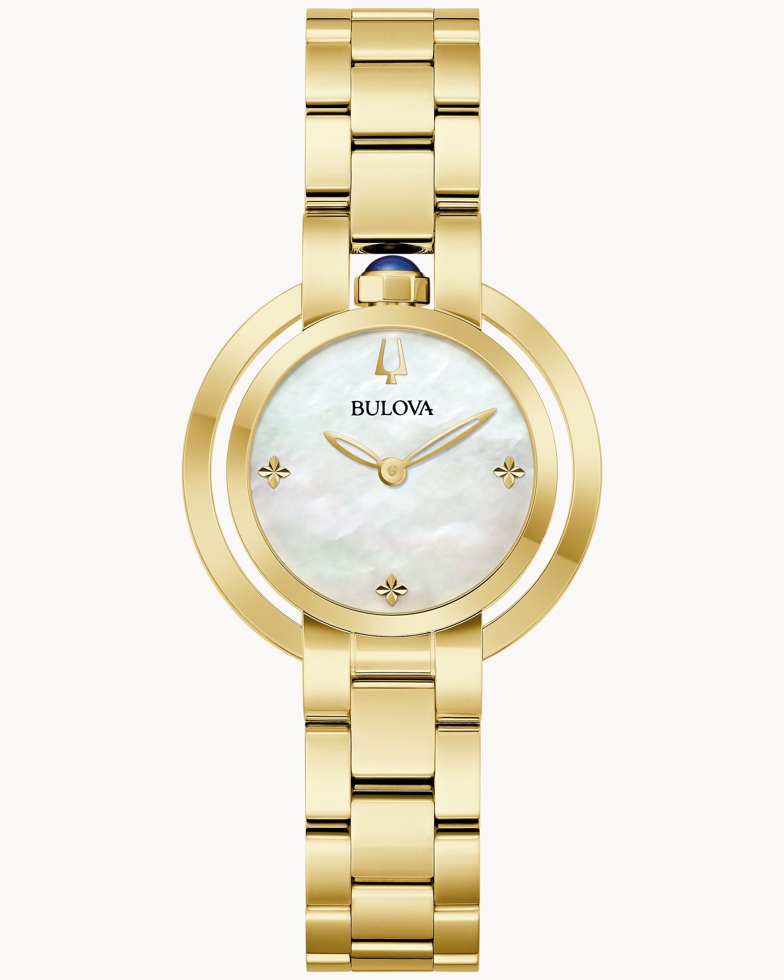 Bulova Rubaiyat 97L181 is a timeless women's watch that beautifully blends classic elegance with refined craftsmanship. The 30.5mm gold-tone stainless steel case is adorned with a synthetic blue spinel cabochon crown, which adds a distinctive touch of luxury. The lustrous white mother-of-pearl dial is accented with elegant gold-tone hands and faceted clover-shaped markers, reflecting light delicately for a sophisticated look.