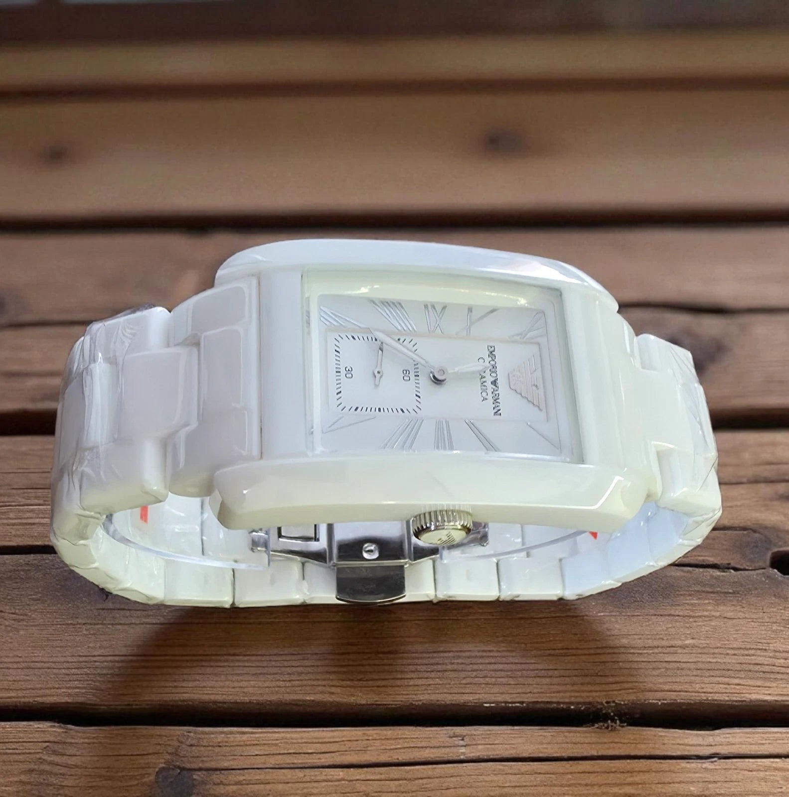 The Emporio Armani AR1408 is a sleek and modern men's watch crafted from premium white ceramic. This elegant timepiece features a 31mm case, a matching white ceramic bracelet, and a minimalist white dial. Its lightweight yet durable ceramic construction makes it perfect for casual wear, while the quartz movement ensures precise timekeeping.