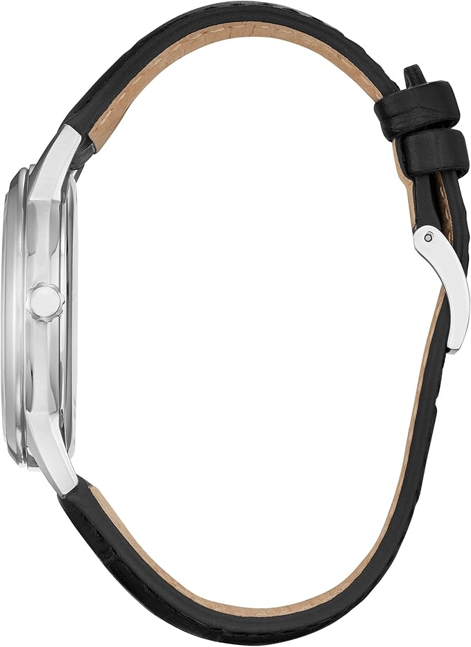 Eco‑Drive (Cal. J810) converts any light into energy for battery‑free ownership. A durable mineral crystal protects the dial, while a comfortable black leather strap (21 mm lug width) and classic buckle keep the fit secure for daily wear.
