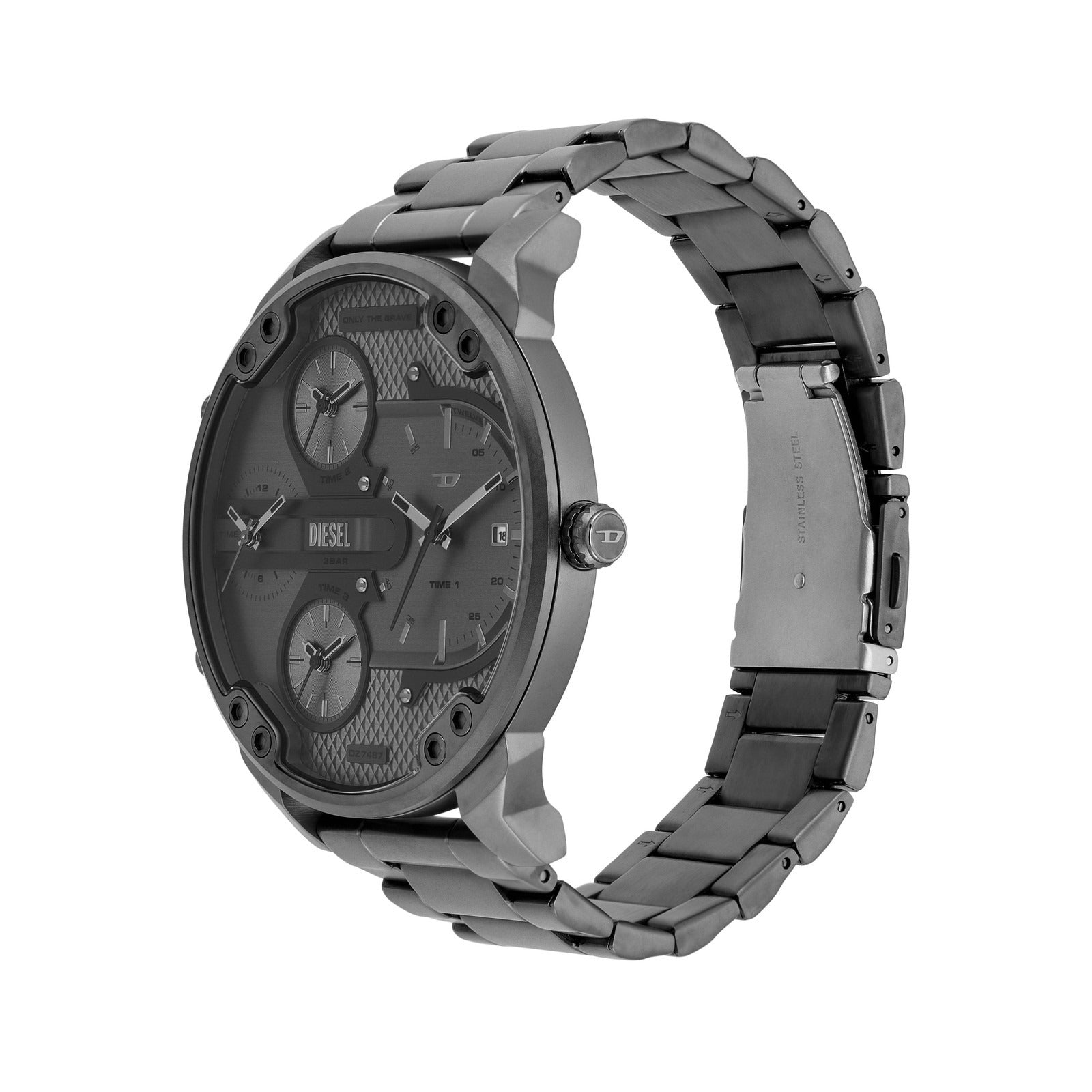 The Diesel DZ7487 Mr. Daddy Slim embodies maximum size and multi-functionality. This watch features an enormous **54mm case**—the largest in the Diesel lineup—finished in a sleek **gunmetal** ion plating across the stainless steel case and bracelet. The gray dial is intricately detailed with textured surfaces and features **four distinct time displays**, making it the ultimate multi-tasking accessory for the global traveler or those who demand an unrivaled wrist presence.